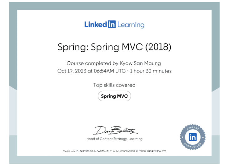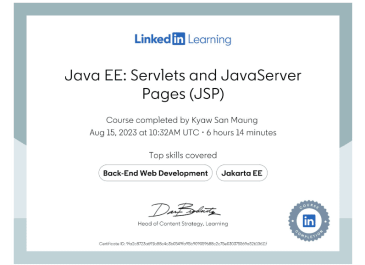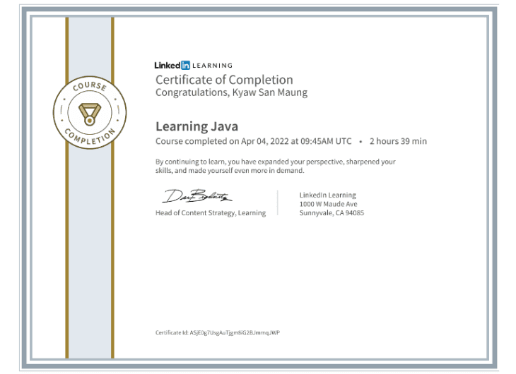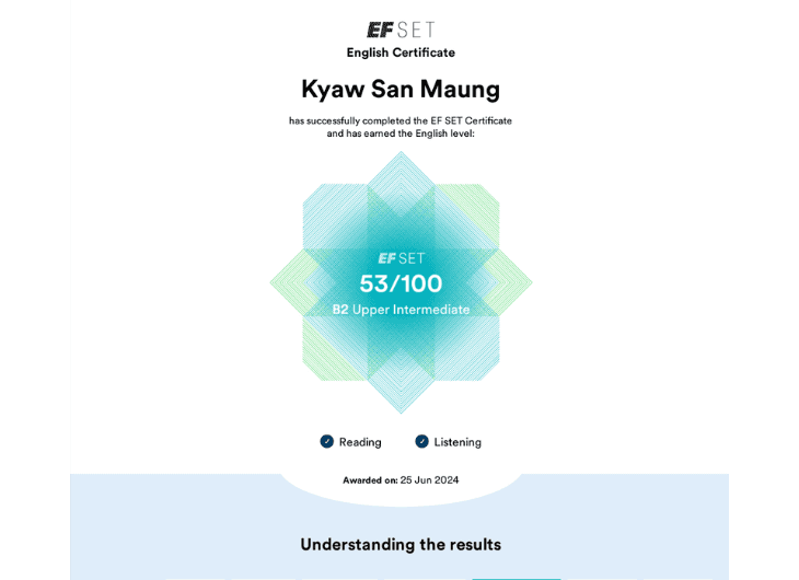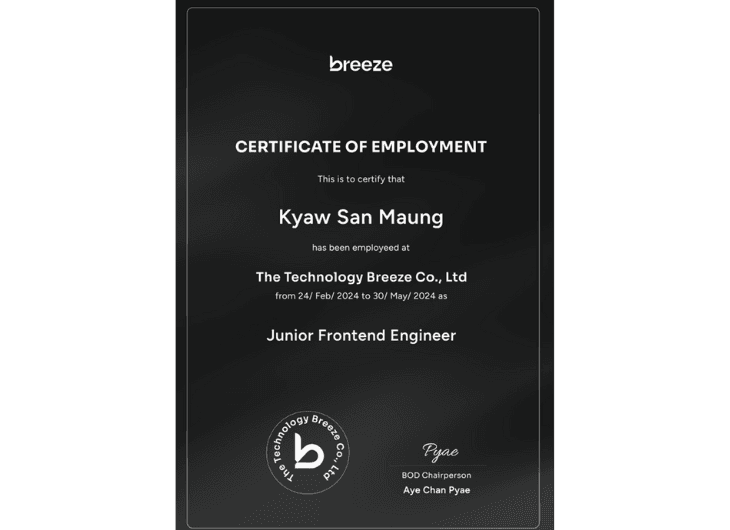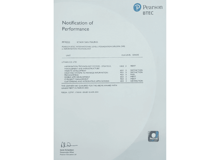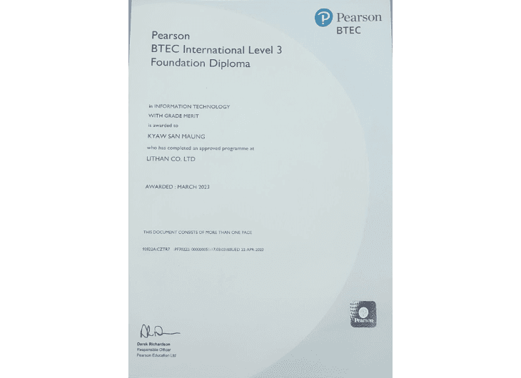 From 2021 to 2022, I completed the Level-3 Foundation in Software Engineering at LITHAN Educlaas. Based in Yangon, Myanmar, this foundational program provided me with a solid grounding in software engineering principles, preparing me for advanced studies and professional growth in the field.