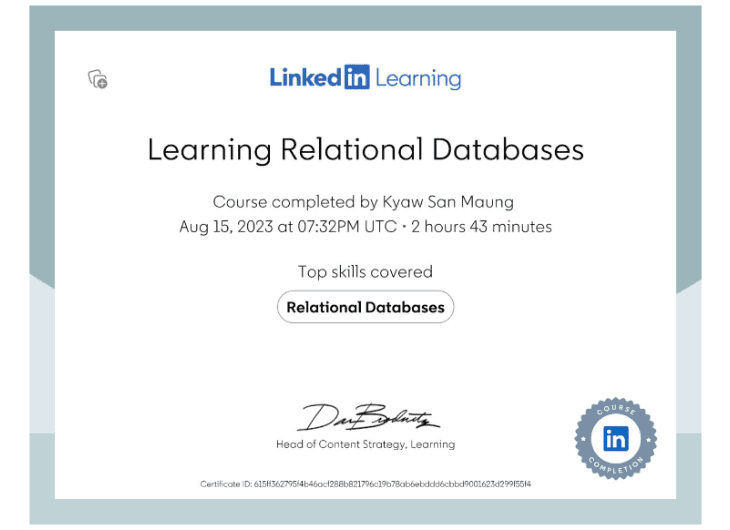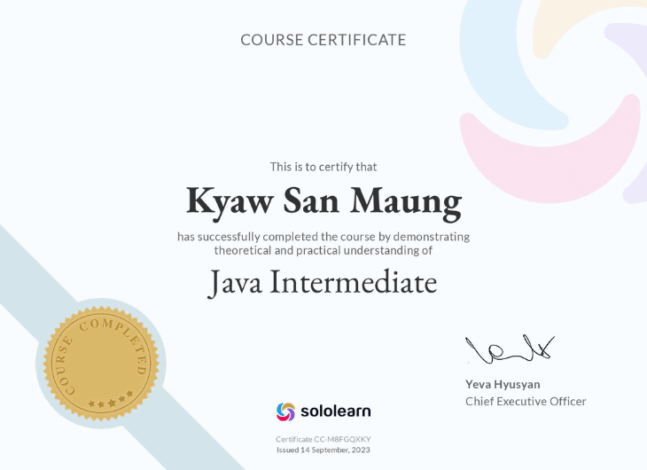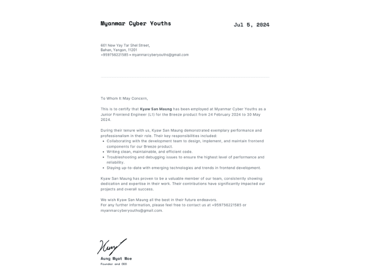 From 2022 to 2023, I have been pursuing a Bachelor of Information System in Software Engineering at LITHAN Educlaas. As a Higher National Diploma in Computing Level-4 student, I am dedicated to developing my expertise in software engineering. Based in Yangon, Myanmar, I continue to enhance my skills and knowledge in this dynamic field.